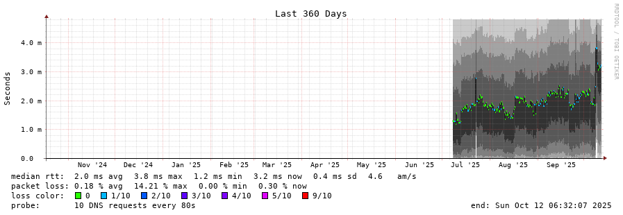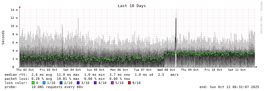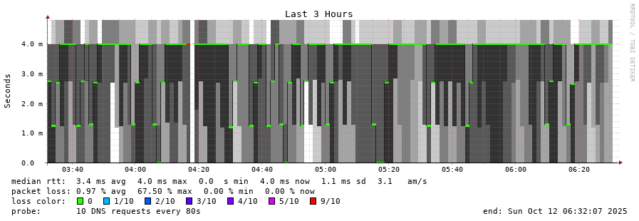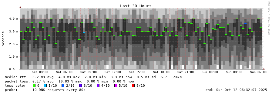 traceroute to 2001:500:2f::f (2001:500:2f::f), 30 hops max, 80 byte packets - Generated at 2025-10-12 06:00:01 3 > f.root-servers.net (2001:500:2f::f) [AS3557] 1.511ms 1.483ms 1.443ms