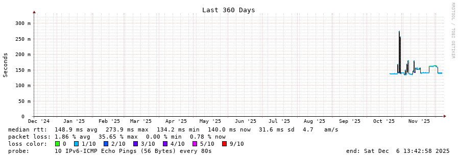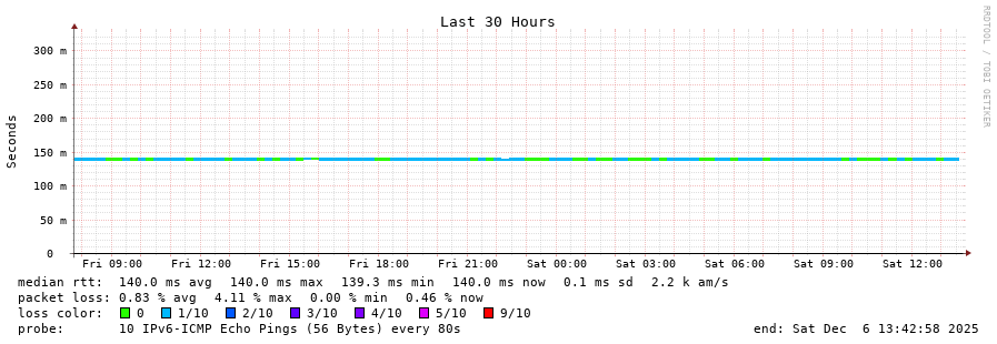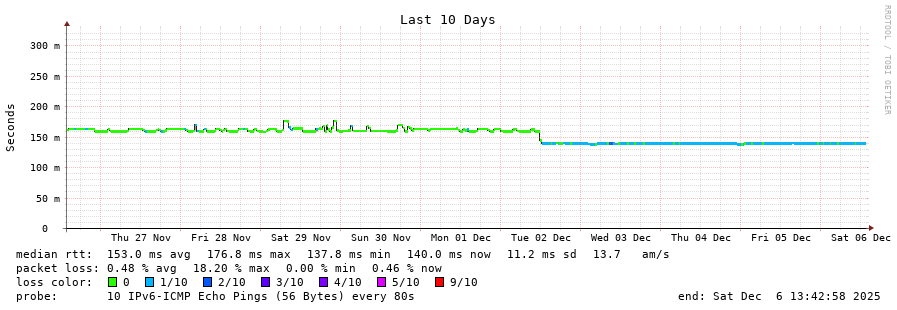 traceroute to 2001:4350:1:1::ff90 (2001:4350:1:1::ff90), 30 hops max, 80 byte packets - Generated at 2025-12-06 13:30:01