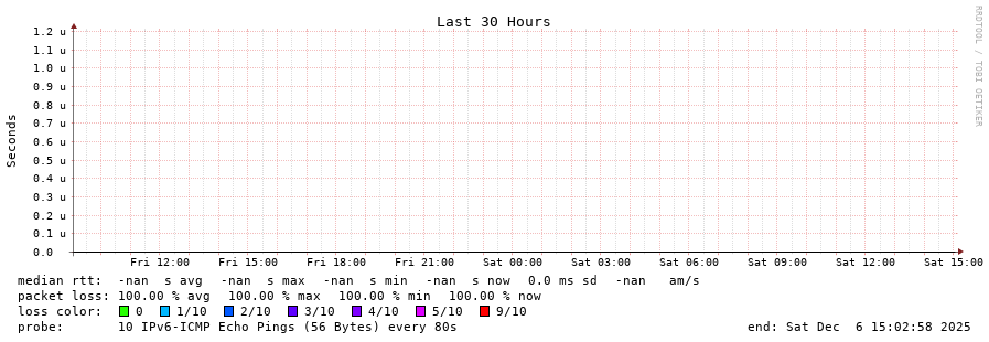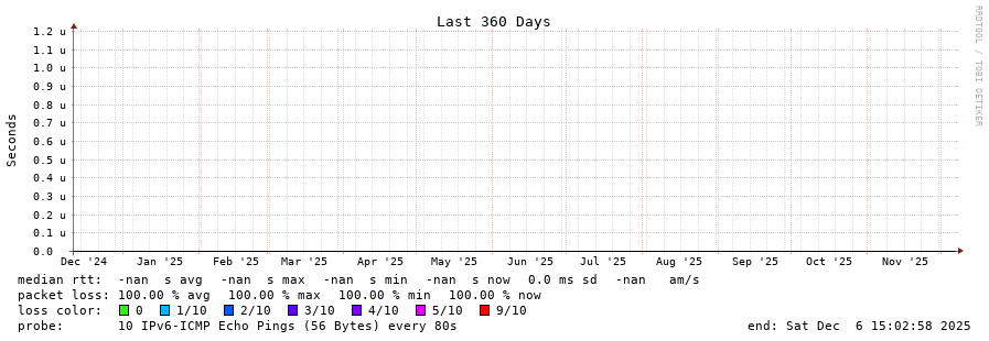 traceroute to fd69:226f:3a3c::2 (fd69:226f:3a3c::2), 30 hops max, 80 byte packets - Generated at 2025-12-06 13:30:01 3 > 2001:550:2:2::2b:1 (2001:550:2:2::2b:1) [AS174] 2.617ms !N