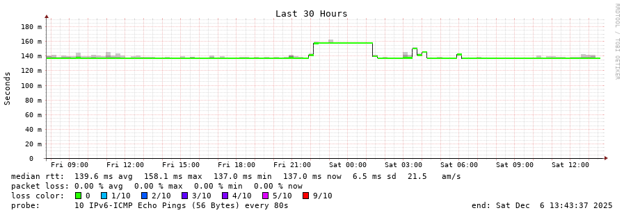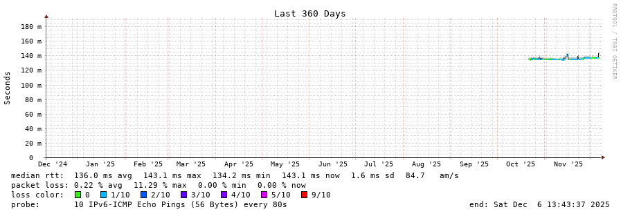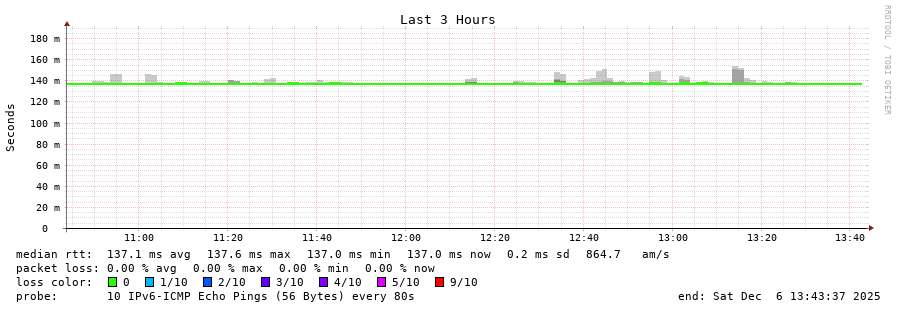 traceroute to 2001:67c:1e0:0:c225:e9ff:fea8:6a0a (2001:67c:1e0:0:c225:e9ff:fea8:6a0a), 30 hops max, 80 byte packets - Generated at 2025-12-06 13:30:01