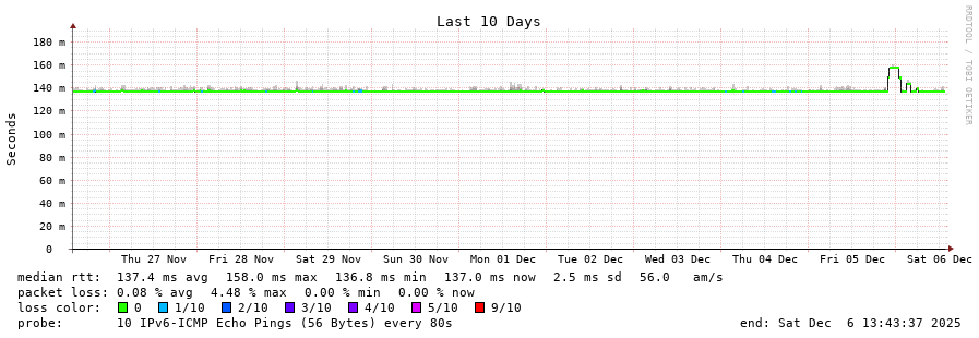 14 > 2a02:2f00:8708::e5 (2a02:2f00:8708::e5) [AS8708] 133.565ms 133.629ms 156.335ms